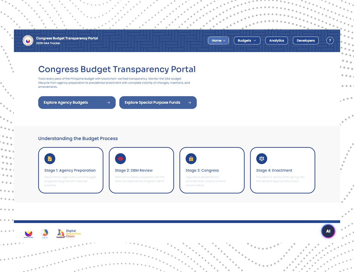 Upon launch, the Digital Bayanihan Chain: - Established a national public reference layer for budget records - Created permanent cryptographic anchors for enacted budget documents - Enabled independent verification by auditors, journalists, and citizens - Improved consistency and reliability across published records - Strengthened auditability and dispute resolution processes - Laid the foundation for lifecycle-wide budget traceability The first phase secured the enacted national budget as a verifiable public record. Subsequent phases extend this integrity layer across releases, execution, and program-level documentation. The Digital Bayanihan Chain now functions as a durable integrity infrastructure that preserves record authenticity beyond individual systems, platforms, or administrations.