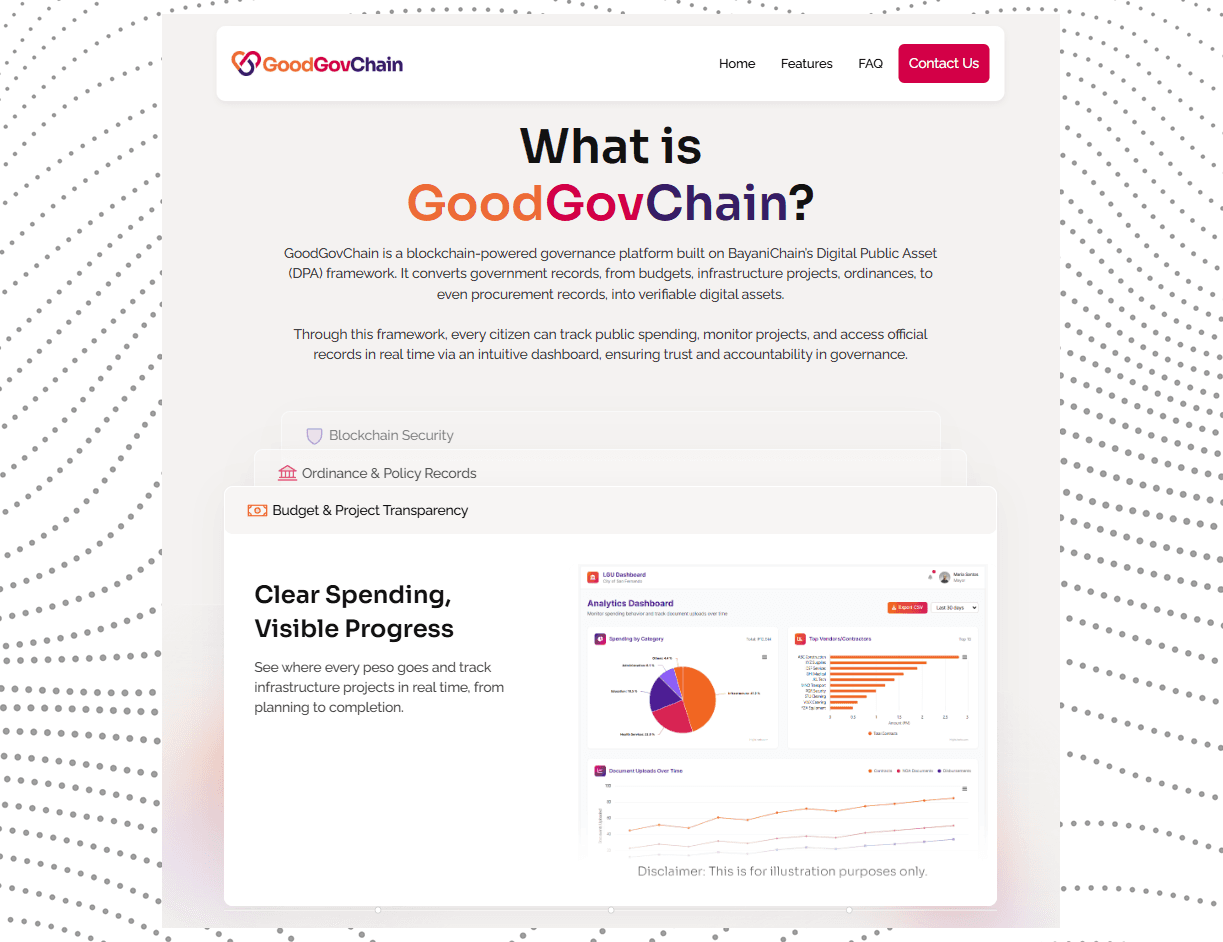 BayaniChain introduced GoodGovChain, the first local government deployment built on Lumen and the Digital Public Assets (DPA) framework. Through this initiative, Baguio transforms critical city documents into verifiable digital public assets, enabling: - On-Chain Transparency – Permits, contracts, and key governance records are tokenized and anchored on a public ledger for tamper-proof validation. - Sharable Proof – Citizens, auditors, and other stakeholders can independently verify documents without relying on a central authority. - Real-Time Dashboards – City officials and residents gain instant visibility into approvals, releases, and updates. - Privacy Controls – Sensitive internal data remains protected while public proofs remain accessible. The platform integrates seamlessly with existing city workflows, allowing Baguio to adopt blockchain without disrupting operations.
